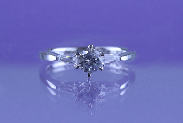 サイドにテーパーカットダイヤをあしらった、スタイリッシュで豪華なエンゲージリングです。